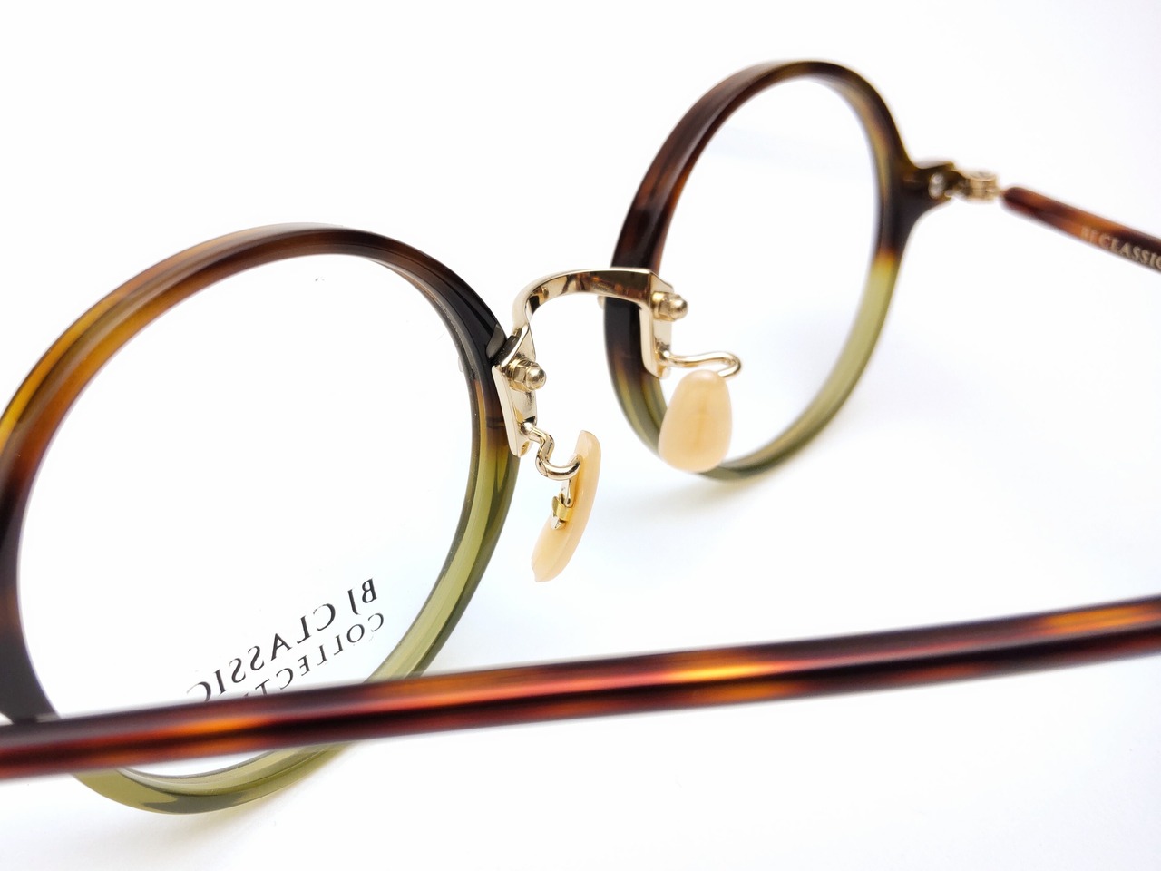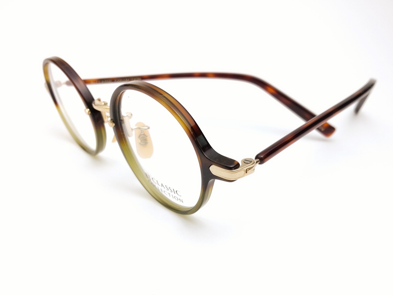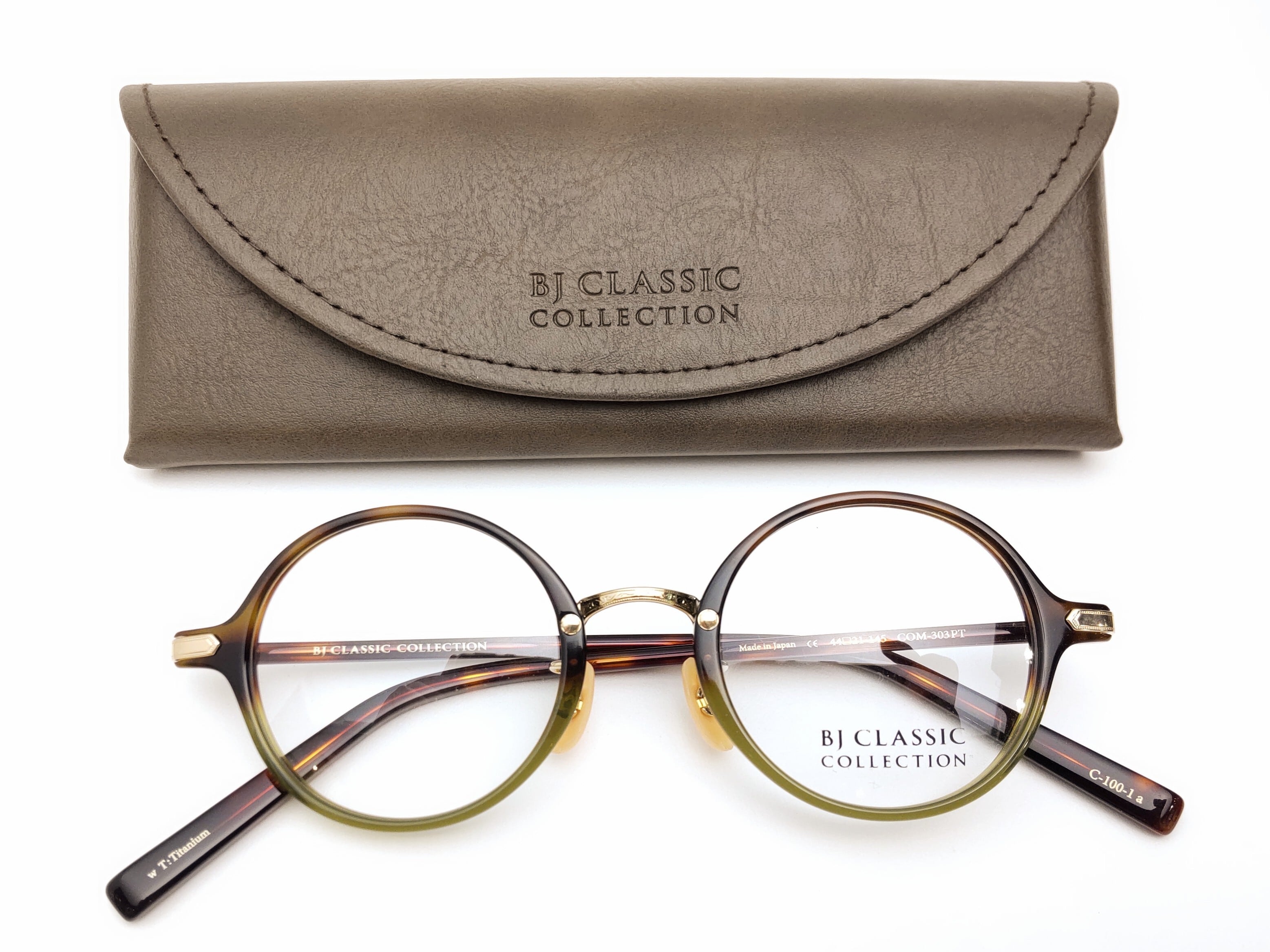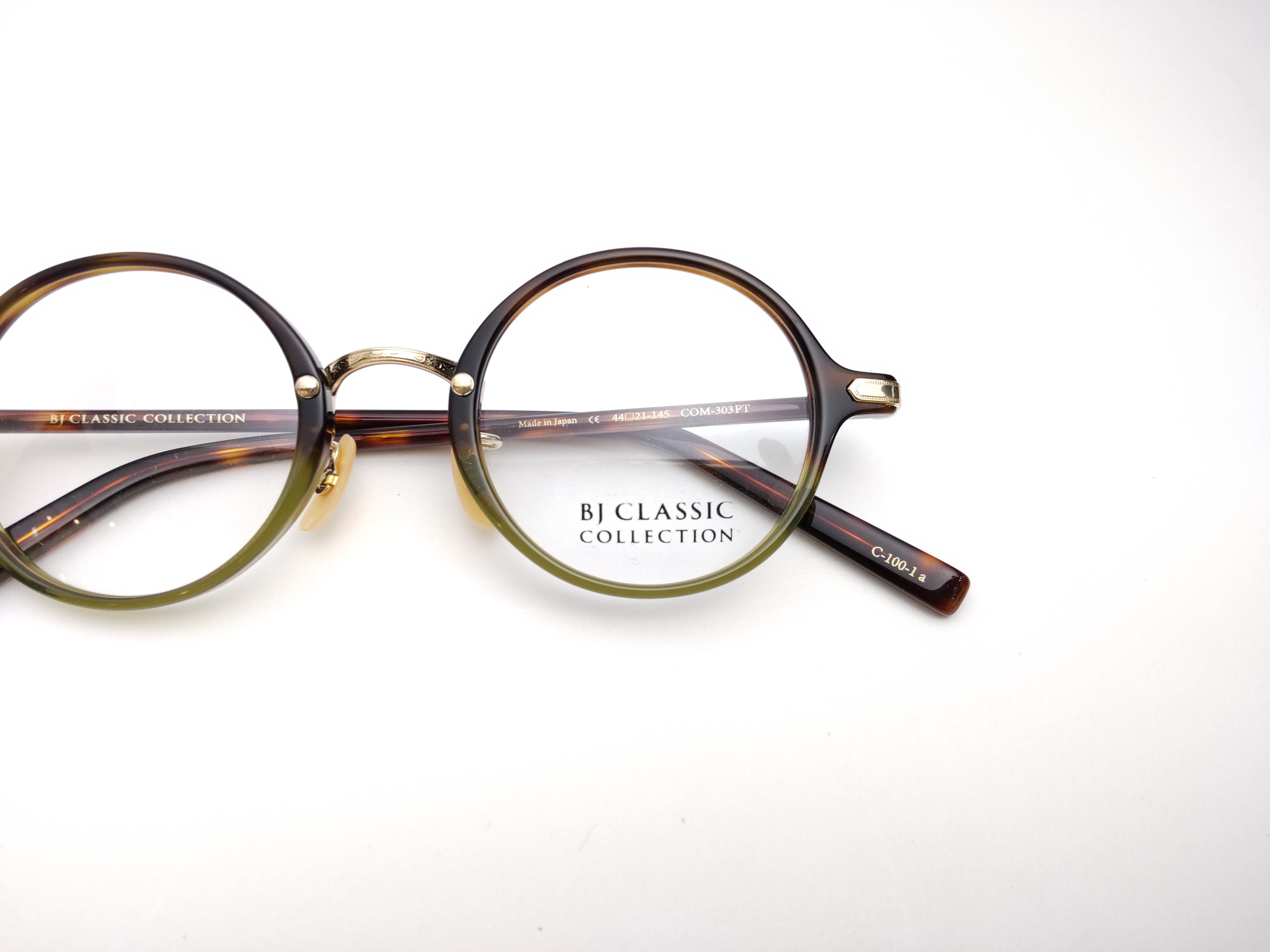 職人が1本1本手作業でつくるBJ CLASSIC COLLECTION。ダークデミとグリーンのコンビネーションカラーで仕上げたシンプルなラウンドタイプのCOM-303PTです。洗練されたデザインは、様々なスタイルに上手にマッチします。