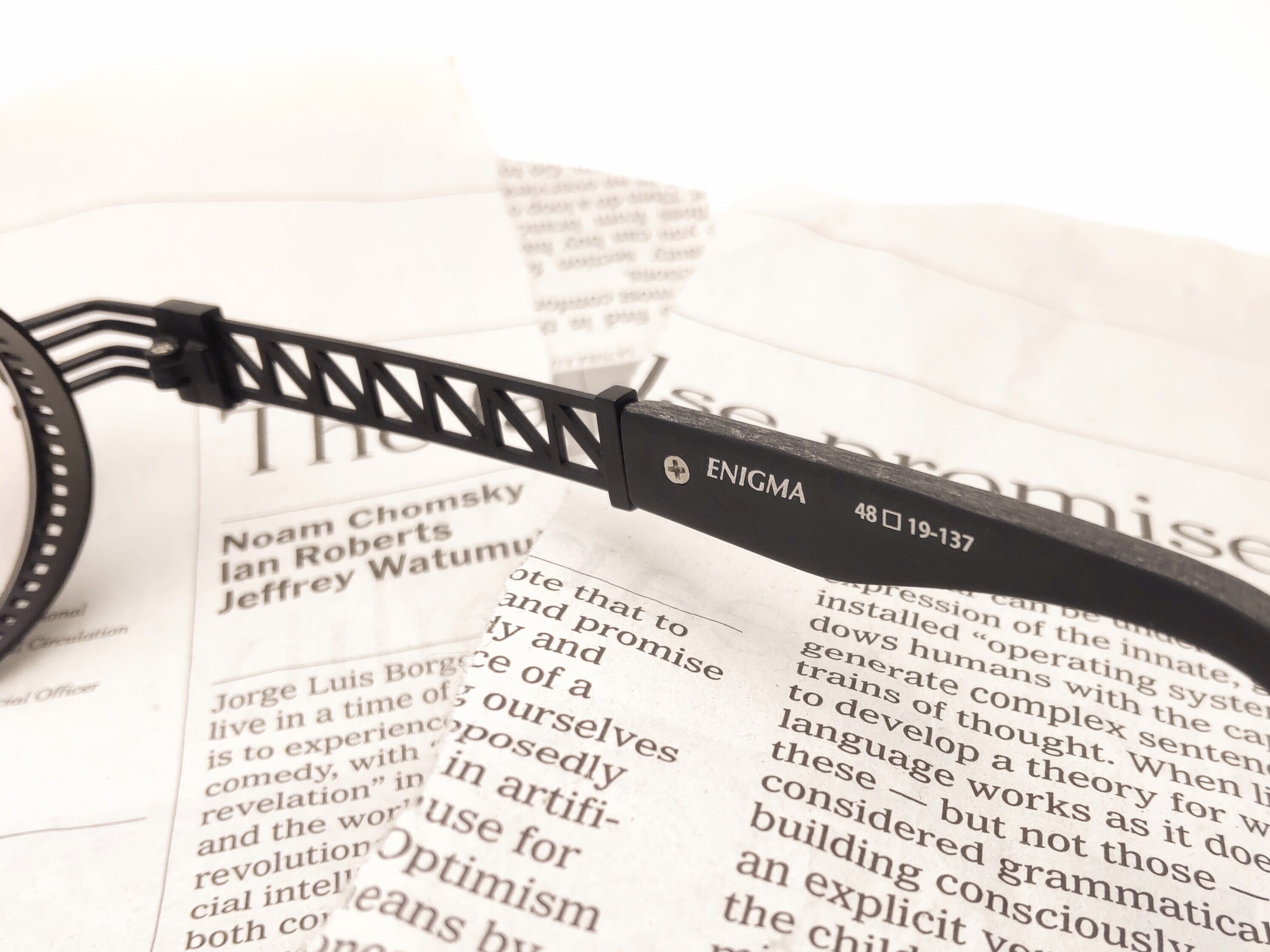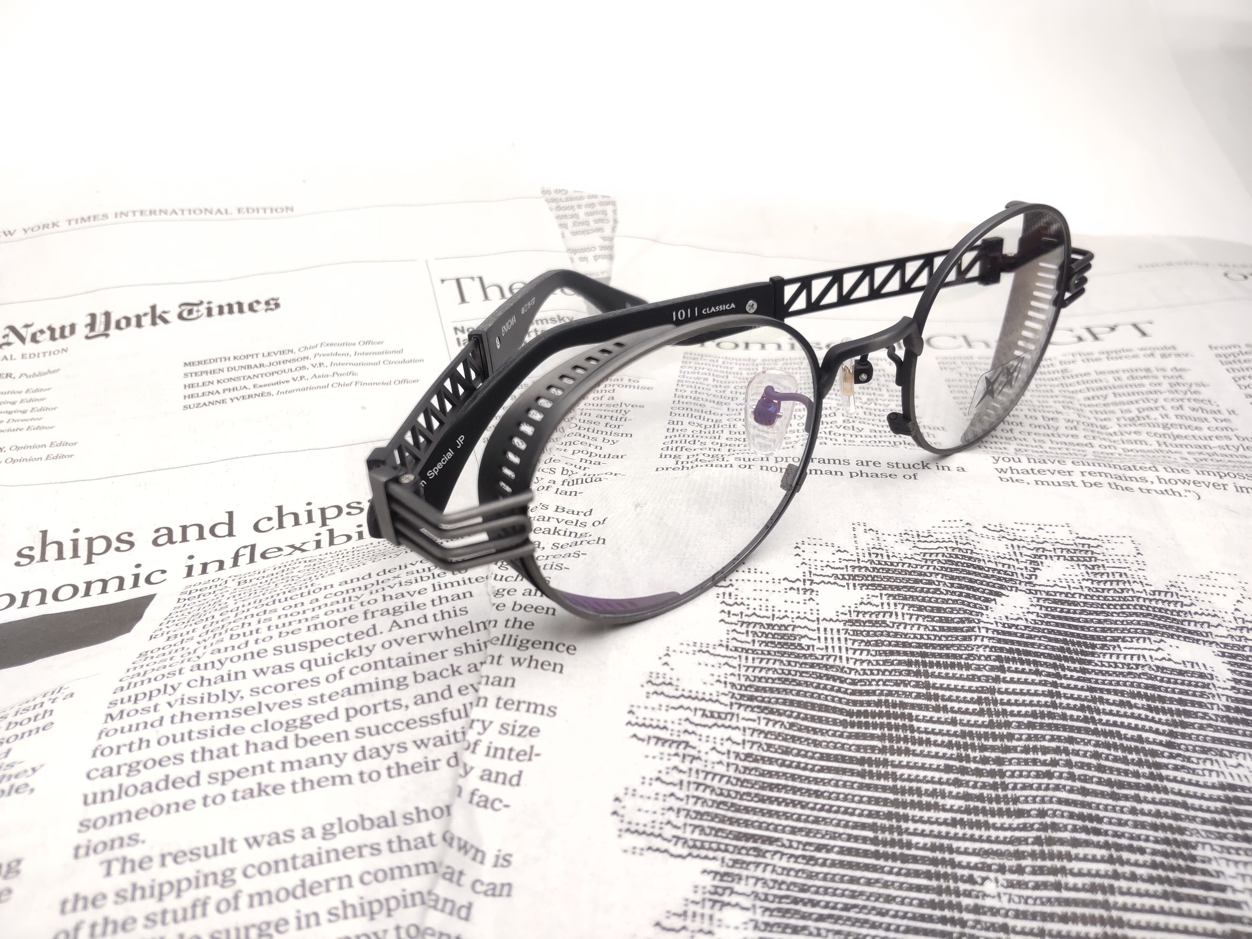 軽量で耐久性に優れたチタン製のメガネ、1011(イチゼロイチイチ) CLASSICA ENIGMA。メタルのフードが特徴的で、クールな雰囲気を演出しています。ハードなデザインながらも、フレームの細部にまでこだわったメタルワークは見ごたえがあります。トレンドを意識しながらも、一つ一つのディテールにこだわったメガネです。